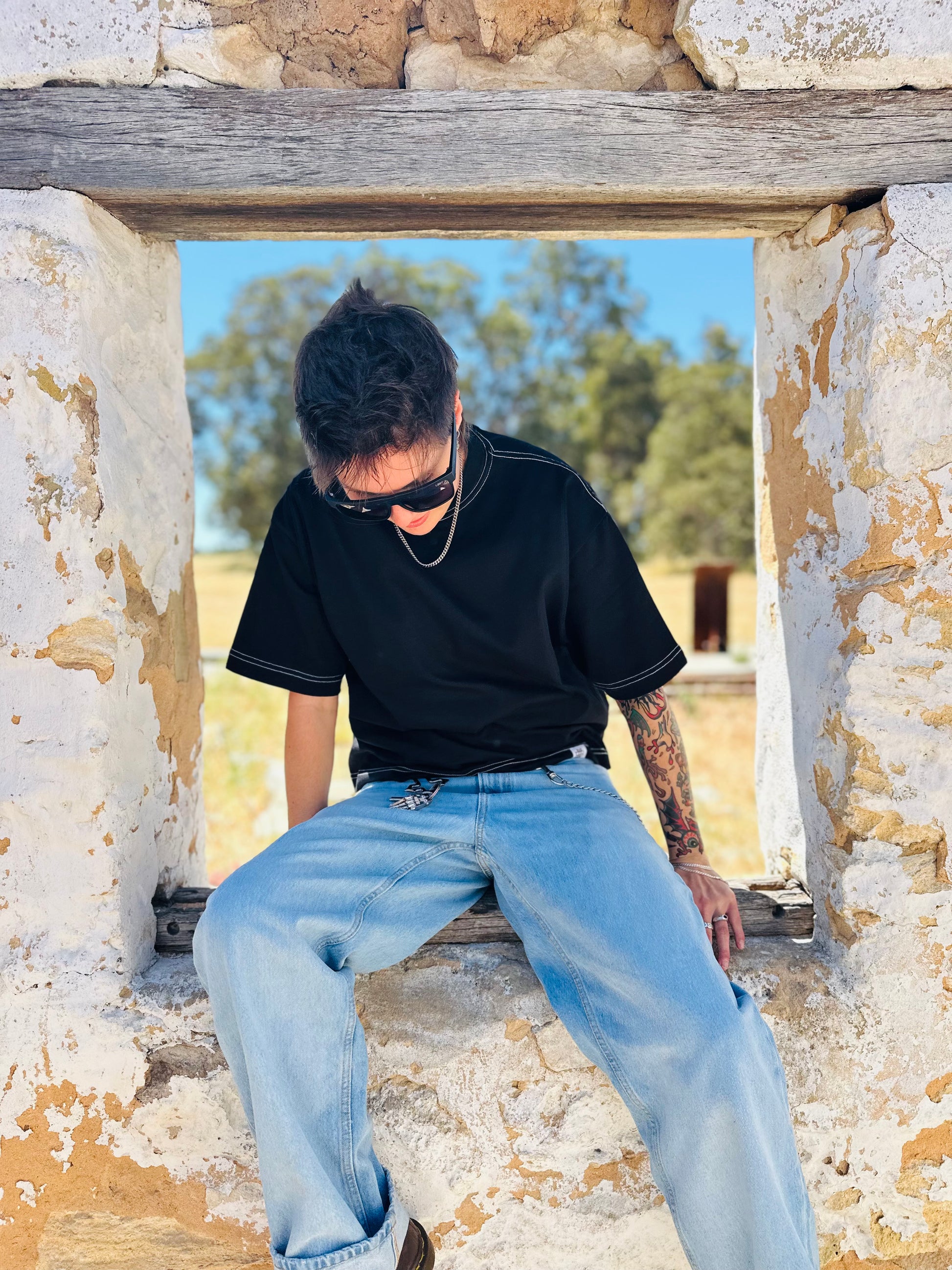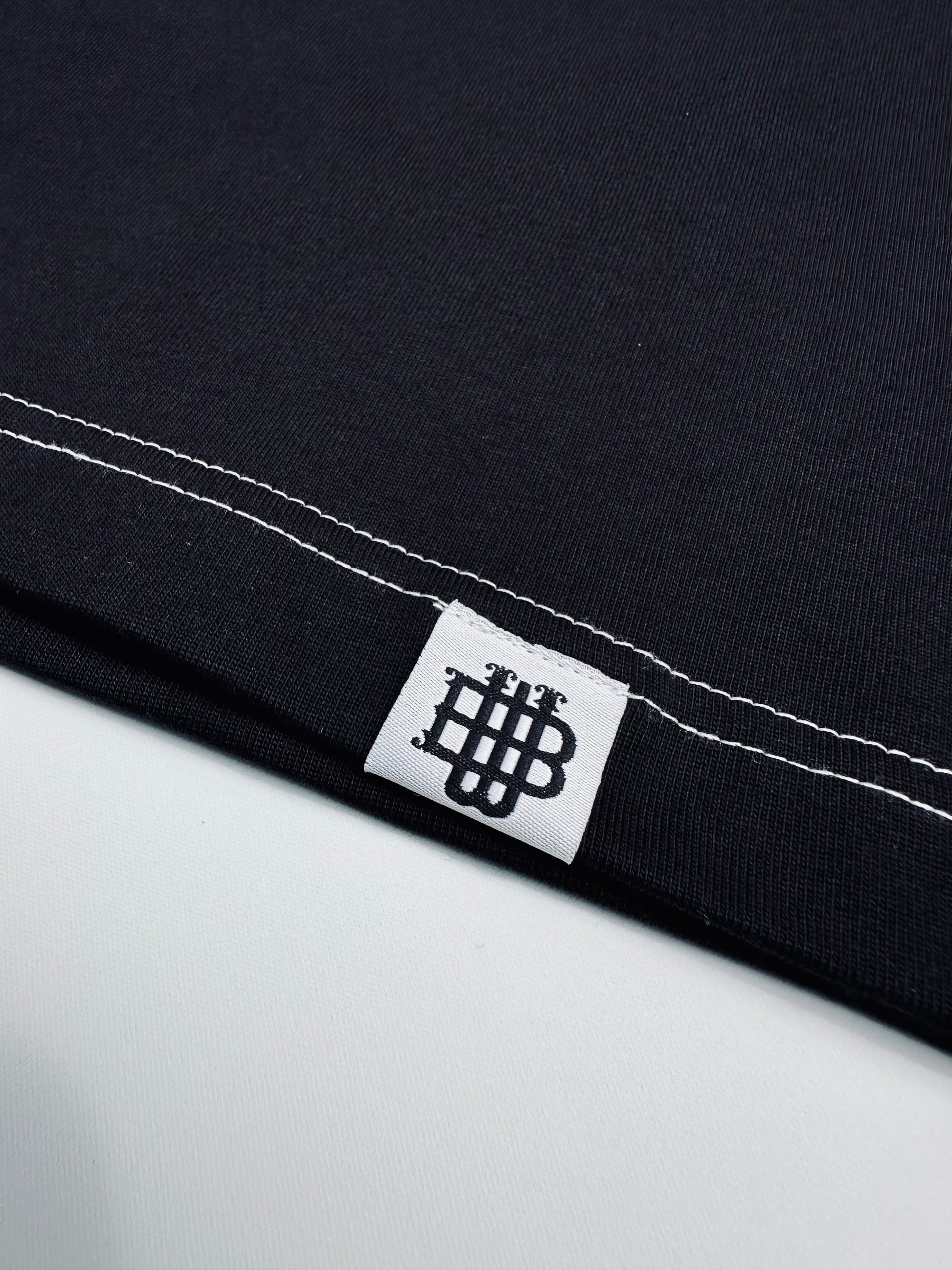 Elevated non- binary basics with this heavy-weight cropped tee, designed for effortless style and everyday wear. Crafted from premium cotton with a structured drop-shoulder silhouette, it features a mock neck collar for a refined edge and contrast white stitching that adds a subtle graphic detail against the deep black base.